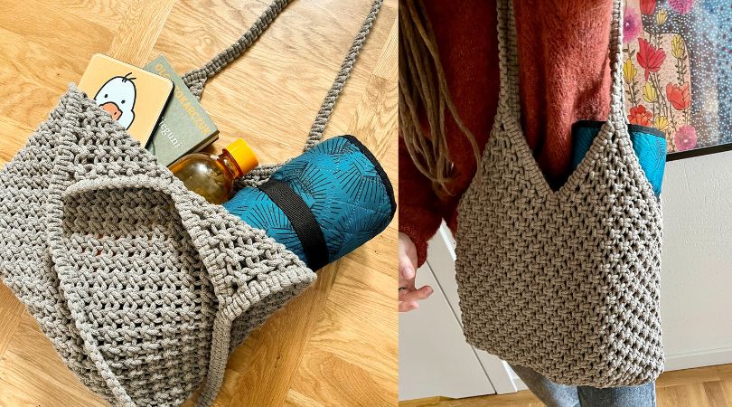Mata do leżenia, butelka wody, czytnik/książka, przekąska i jeszcze kilka drobiazgów – wszystko to zmieści się do torby z tego wyzwania. To dlatego, że jest naprawdę duża: sam worek to ok. 40×40 cm, a rączka ma 60 cm. Do jej wykonania będziesz potrzebować ok. 150 m sznurka bawełnianego plecionego 5 mm.