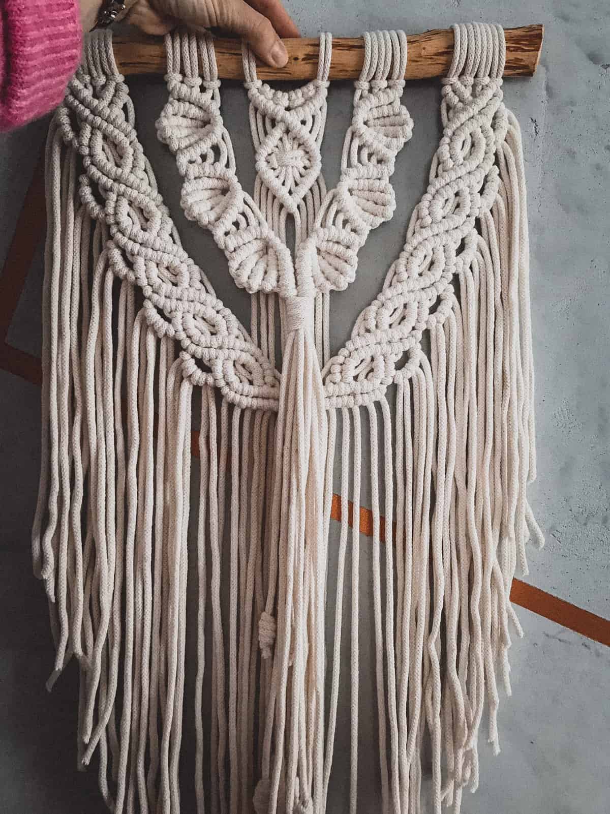 Makrama po wykonaniu ma wymiary: szerokość ok. 40 cm x długość zależna od długości frędzli – od 50 do 100 cm.